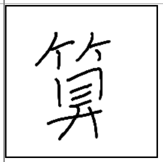 | 셈할산 | 셈할산, 대죽, 눈목, 받들공, ., ., 손에 산가지를 들고 눈으로 보면서 계산하는 모습. 계산(計算)대죽, ., ., ., ., ., 잎이 뾰족하고 군집을 이루며 자라는 대나무 모양눈목, ., ., ., ., ., 눈과 눈알을 90도 회전한 모양받들공, ., ., ., ., ., 두 손으로 무언가 받드는 모양., ., ., ., ., ., .., ., ., ., ., ., . | ||||||
