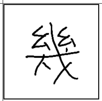 | 幾 | 幾 | 幺 | 幺 | 戈 | 人 | . | 실을 창날같은 기구가 있는 베틀에 걸고 실이 몇가닥인지 세는 사람 모습. |