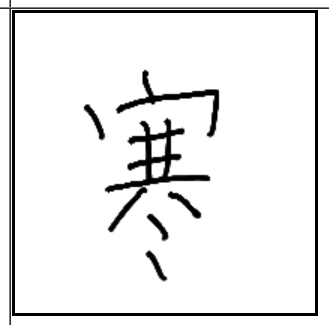 | 寒 | 寒 | 宀 | 共 | 冫 | . | . | 집안에 얼음이 얼어서 한기가 들어 손을 모으고 호호 입김을 불고 있는 모양. 혹한기. |