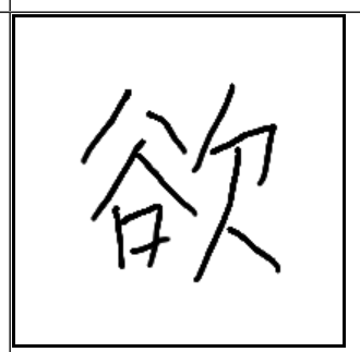 | 欲 | 欲 | 谷 | 欠 | . | . | . | 골짜기에서 흘러 나오는 물을 하품하듯 입을 크게 벌리고 벌컥 벌컥 마시는 욕망에 찬 모습. 욕구. |