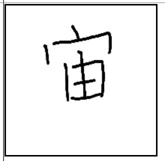 | 宙 | 宙 | 宀 | 由 | . | . | . | 집안에 등불이 켜져 거주하기 좋은집, 따뜻한 집. 주택. |