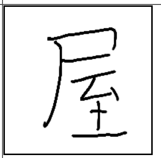 | 屋 | 屋 | 尸 | 至 | . | . | . | 위에 두터운 지붕이 있고 사람들이 화살이 땅에 박히듯 방에 틀어 박혀서 나오지 않는 편안한 집. 옥상. |