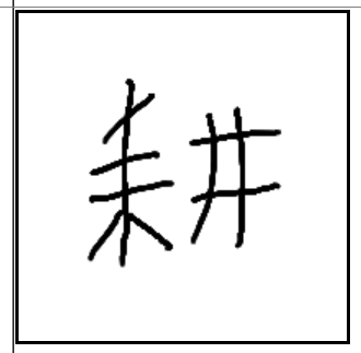 | 耕 | 耕 | 耒 | 井 | . | . | . | 쟁기로 밭을 갈 때 우물정자 처럼 반듯하게 가는 모양. 경작. |