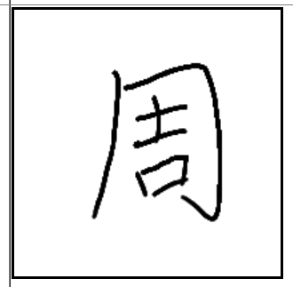 | 周 | 周 | 冂 | 土 | 口 | . | . | 밭 한쪽에 쌓여있는 흙더미를 밭의 가장자리까지 두루 펴는 모습. 주변. |