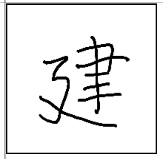 | 建 | 建 | 聿 | 廴 | . | . | . | 붓으로 도면을 그린 후 천천히 걸으며 걸음으로 길이를 재고 건물을 건축하는 모습. 건축. |