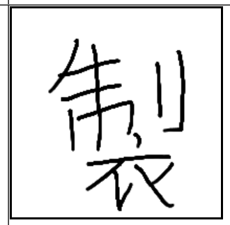 | 製 | 製 | 牛 | 巾 | 刂 | 衣 | . | 수건모양 소가죽 원단을 칼로 잘라서 옷을 만드는 모양. 제조. |