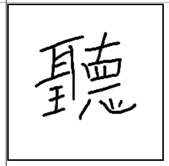 | 聽 | 聽 | 耳 | 玉 | 直 | 心 | . | 백성들의 소리를 들은 임금이 소리로 백성의 형편을 열 번 눈으로 보고 숨은 것을 보는 것처럼 마음으로 그 형편을 헤아리는 모양. 청력. |
