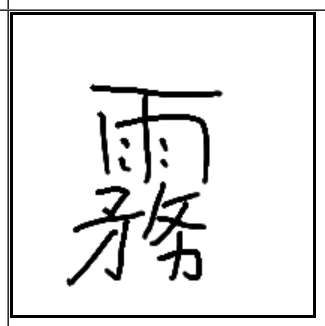 | 霧 | 霧 | 雨 | 務 | . | . | . | 비처럼 내려오는데 앞이 보이지 않아 창과 몽둥이를 들고 힘을 쓰기가 더 어려워 지게 만드는 안개. 해무. |