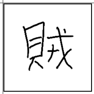 | 賊 | 賊 | 貝 | 戈 | 十 | . | . | 돈을 훔치려고 창을 열 개나 들고 쳐들어 오는 도적 모습. |