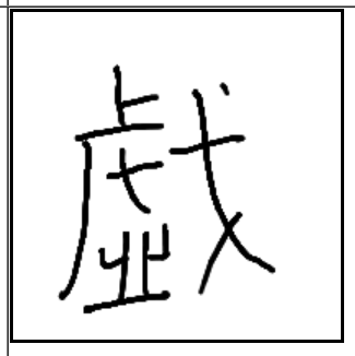 | 戱 | 戱 | 虛 | 戈 | . | . | . | 호랑이가 나타나서 숲이 비고 사람들이 창을 들고 호랑이를 잡는 다는 스토리의 연극을 하며 노는 모습. 유희. |