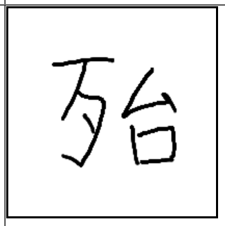 | 殆 | 殆 | 歹 | 始 | . | . | . | 뼈가 드러날 정도로 다친 사람이 여자가 아기를 팔에 안고 먹이는 이유식 같은 미음을 비로소 먹고 있지만 생명이 위태로운 모습. |