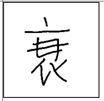 | 衰 | 衰 | 衣 | 丑 | . | . | . | 짐승의 발톱에 옷이 상한 모습. 쇠퇴(衰退) |