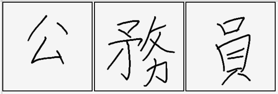 | 公務員 | 公務員 | 公 | 務 | 員 | . | . | 공공의 일을 하기 위해 창과 몽둥이로 힘을 쓰는 권한을 받은 돈 받고 일하는 인원. |
