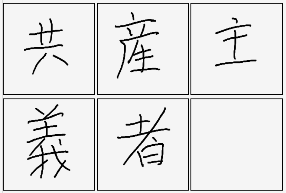 | 共産主 | 共産主義者 | 共 | 産 | 主 | 義 | 者 | 함께 생산하고 함께 나누는 것을 가장 좋은 것으로 여기는 사람들. |