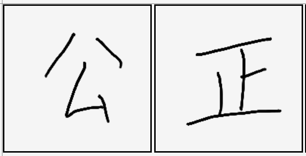 | 公正 | 公正 | 公 | 正 | . | . | . | 공공의 이익을 추구하고 누구에게 든 적정하고 정확하게 대한 것. 공정무역. |