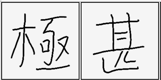 | 極 | 木 | 丂 | 口 | 又 | 一 | 나무 앞에서 무당이 공교롭게 주문을 말하고 손으로 극진하게 비는 모습. 극진. | |