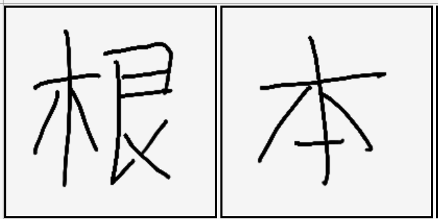 | 根本 | 根本 | 根 | 本 | . | . | . | 나무의 눈은 뿌리이다. 나무의 뿌리는 나무의 근본이다. 무언가의 뿌리를 근본이라고 함. |