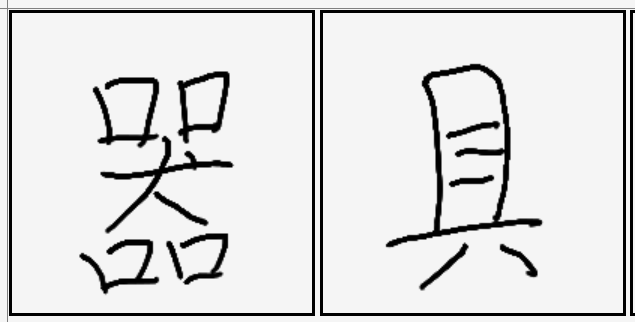 | 具 | 且 | 八 | . | . | . | 찬합에 밥과 반찬을 갖추기 위해, 구비하기 위해 움직이는 팔 모양. 구비. | |