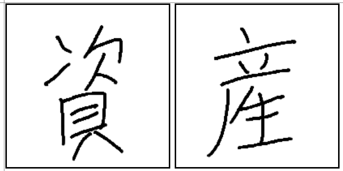 | 資産 | 資産 | 資 | 産 | . | . | . | 재물이 낳은 자식처럼 주렁주렁 인 것을 자산이라고 함 |