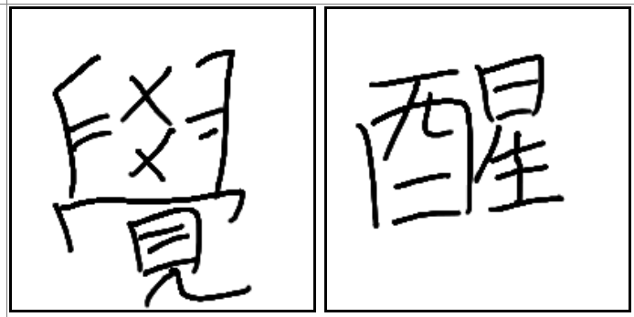 | 覺醒 | 覺醒 | 覺 | 醒 | . | . | . | 산가지로 숫자 계산을 보면 깨닫는다. 술을 먹은 후 날이 밝아 깨어나며 살아남. 깨달음, 술깸 합쳐서 각성 |