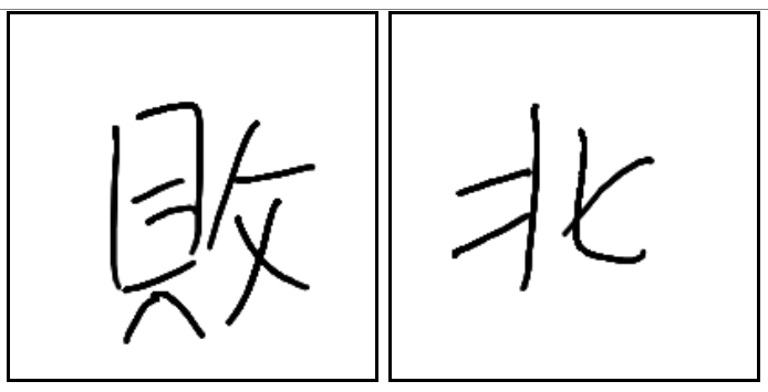 | 敗北 | 敗北 | 敗 | 北 | . | . | . | 돈을 치면 패한다 패, 등을 보이는 모습 배, 패해서 등을 보이고 달아나는 모습. 패배. |