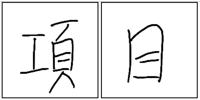 | 항목 | 항목, 항목항, 눈목, ., ., ., 머리로 공사의 항목을 칸칸이 써 놓은 것을 항목이라고 함. 항목항, 장인공, 머리혈, ., ., ., 장인이 머리로 공사의 항목을 떠올리는 모양. 항목.눈목, ., ., ., ., ., 눈과 눈알을 90도 회전한 모양., ., ., ., ., ., .., ., ., ., ., ., .., ., ., ., ., ., . | ||||||