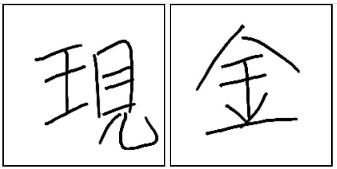 | 現金 | 現金 | 現 | 金 | . | . | . | 현재 상황에서 눈에 보이고, 사용 가능한 돈을 현금이라고 함. |